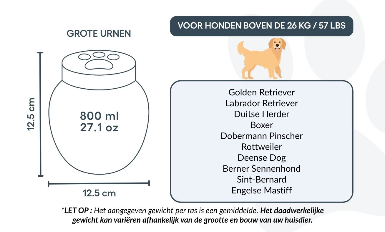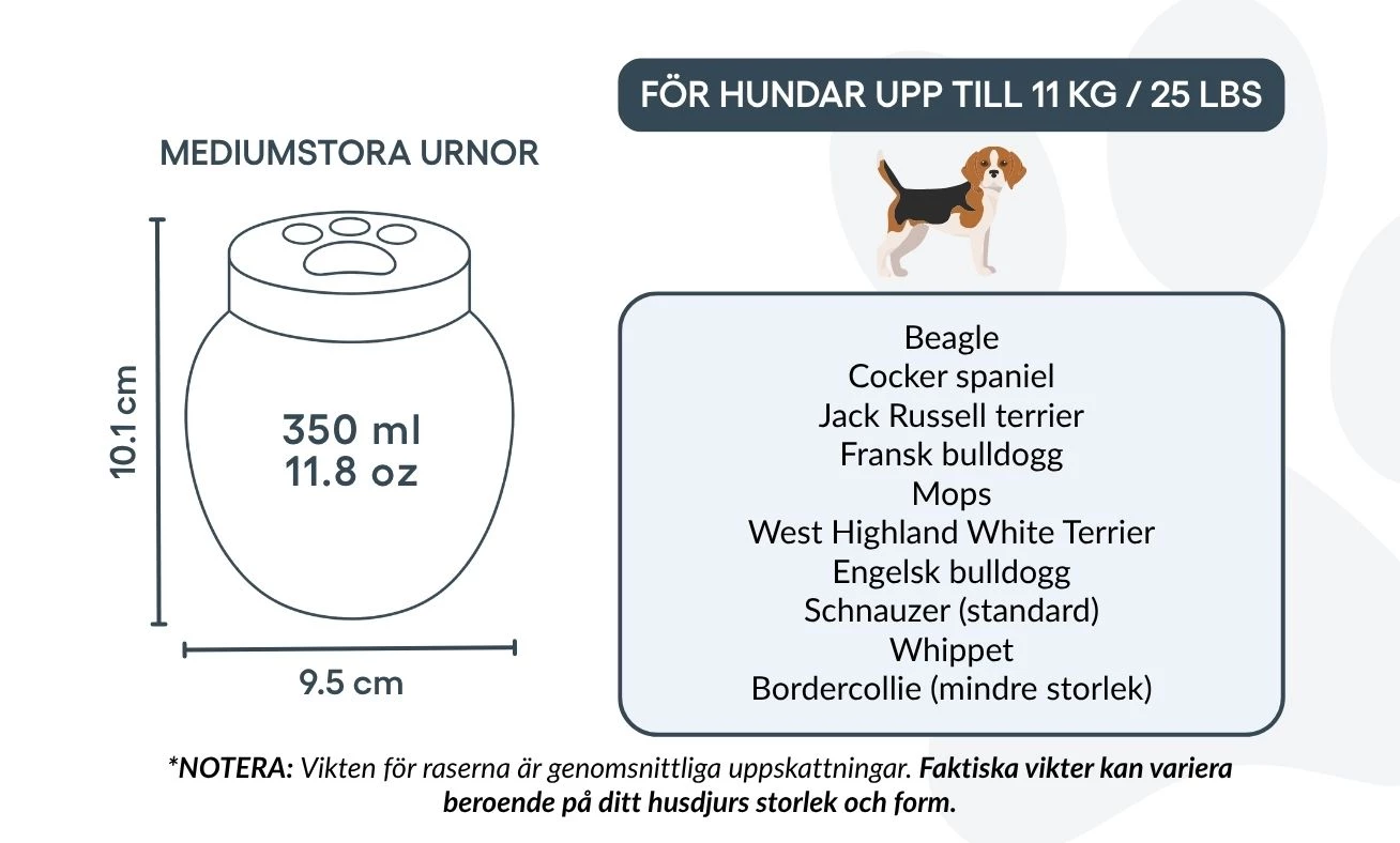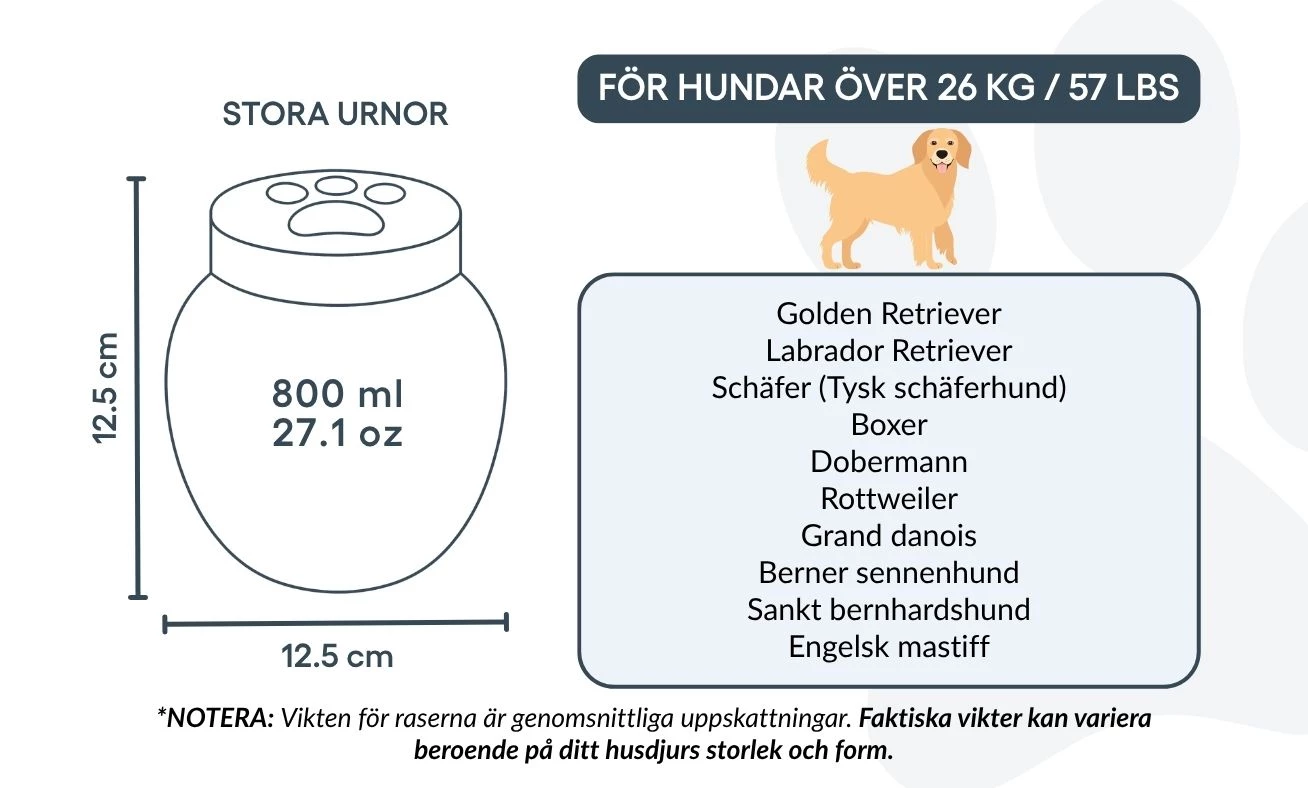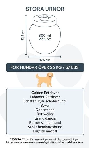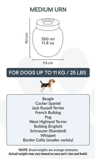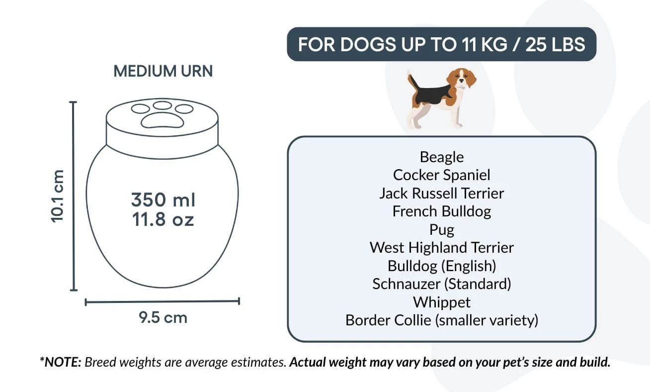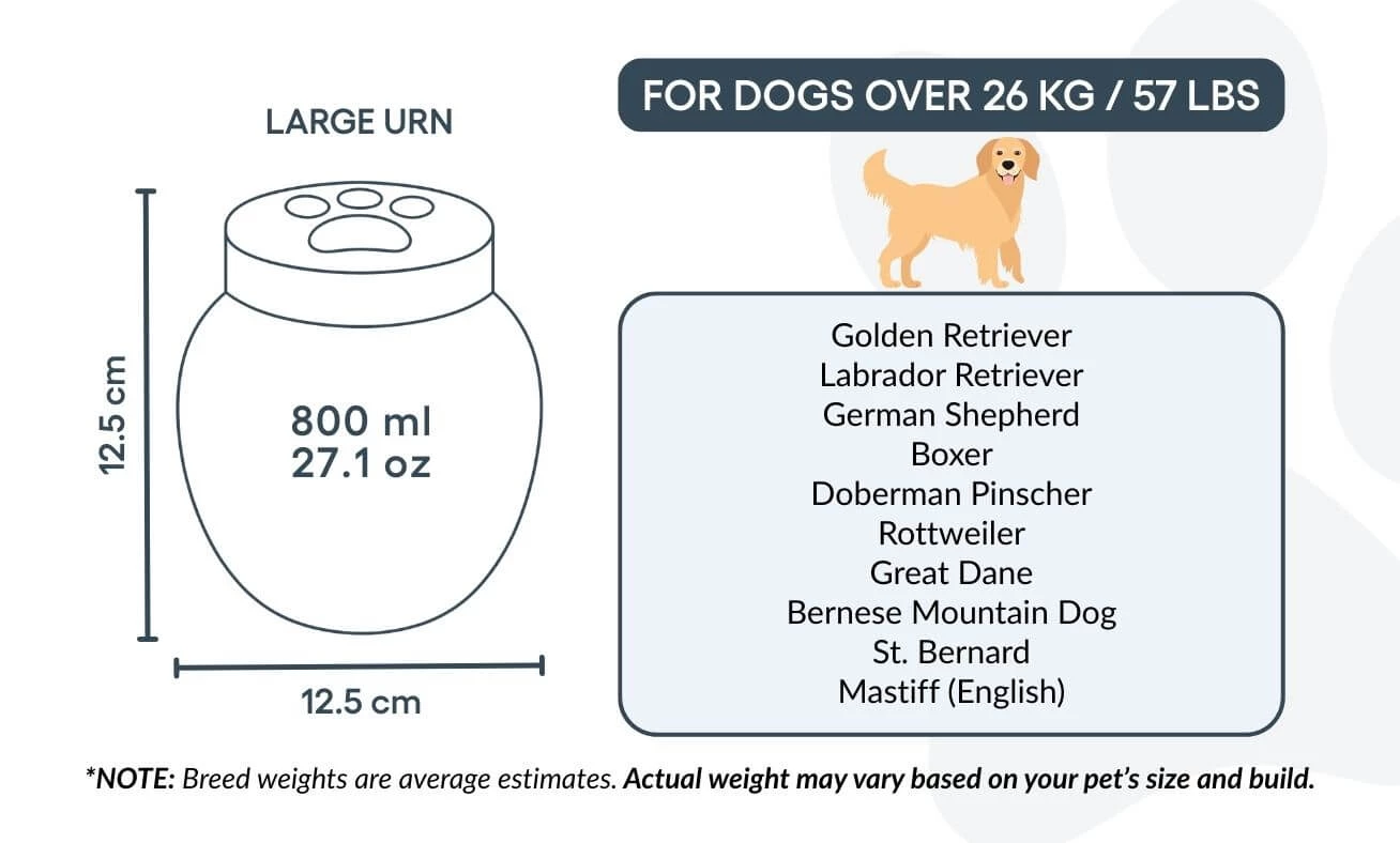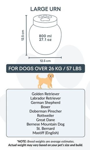 Available in multiple sizes to accommodate dogs of all breeds, this photo urn is ideal for pet cremation and remembrance.