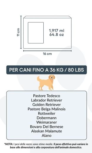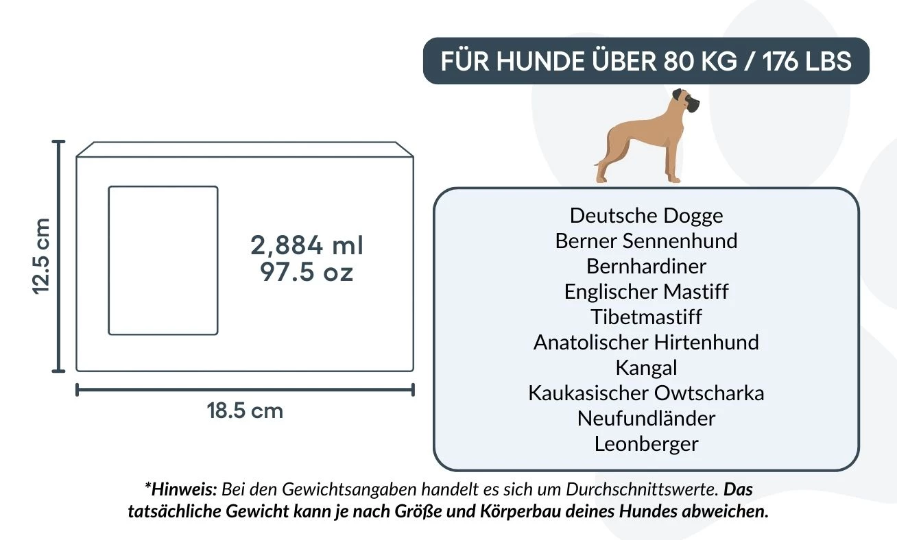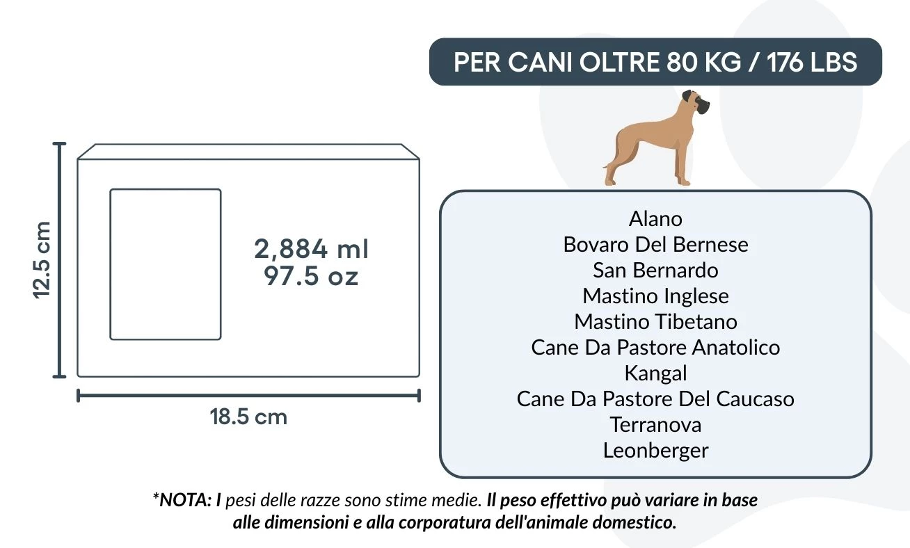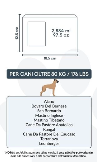 Size / Urn Capacity: 18 cm (L) x 12.2 cm (W) x 12.5 cm (H) | ~2,869 ml / 175 cubic inches / 101.6 oz | for dogs up to 95 kg / 204 lbs