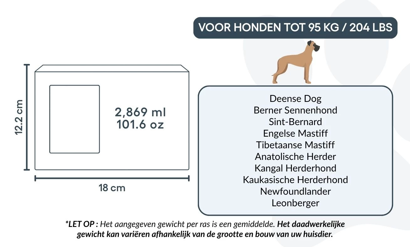 Size / Urn Capacity: 18 cm (L) x 12.2 cm (W) x 12.5 cm (H) | ~2,869 ml / 175 cubic inches / 101.6 oz | for dogs up to 95 kg / 204 lbs