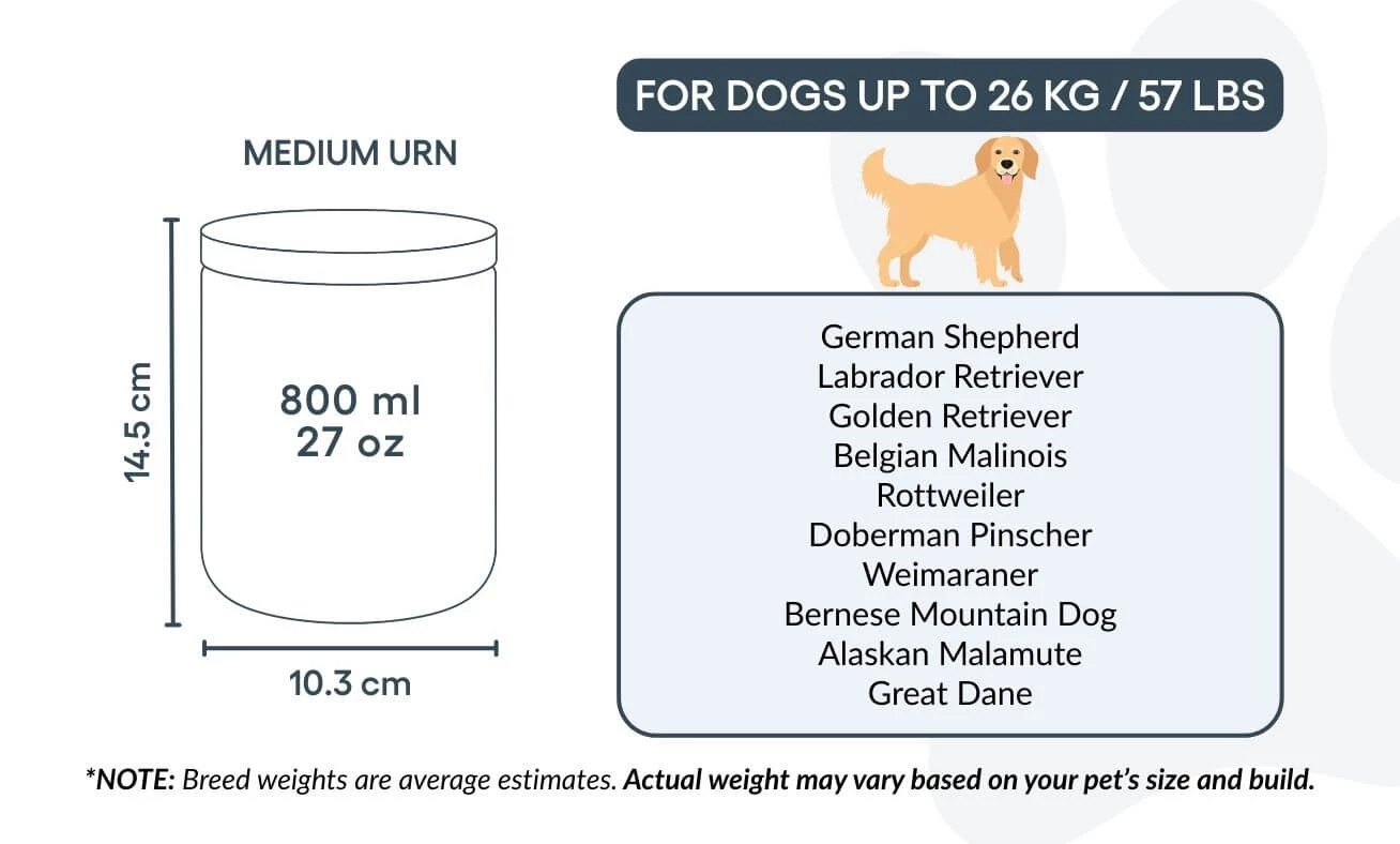 Perfect for pet cremation, this ceramic urn is available in two sizes to suit dogs up to 26kg. Whether displayed on a shelf or tucked into a private memory spot, this urn with photo is a respectful way to keep your companion close.