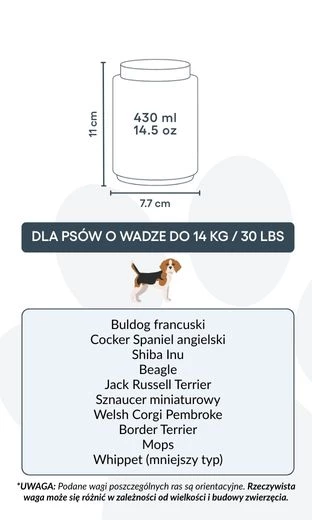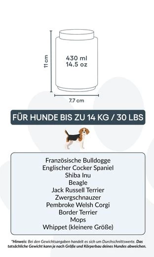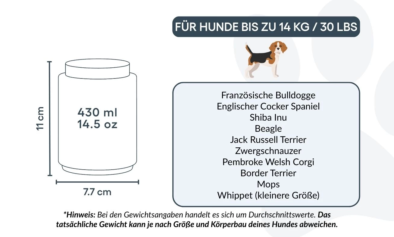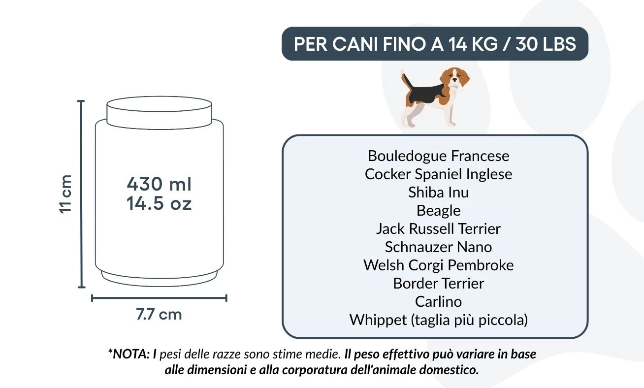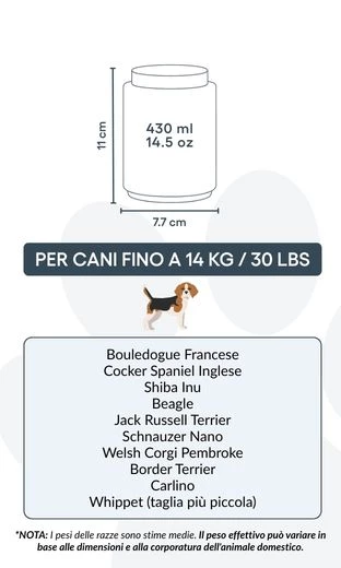 Small: 7.7 cm (W) x 11 cm (H) x 7.7 cm (L) | 430ml / 14.5 oz | for dogs up to 14kg / 30lbs