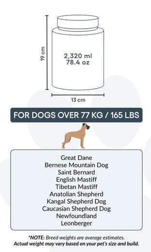 Large: 13 cm (W) x 19 cm (H) x 13 cm (L) | ~2,320 ml / 78.4 oz – suitable for dogs up to approx. 77 kg / 165 lbs