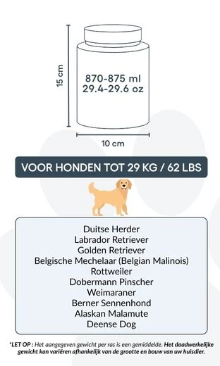 Small: 10 cm (W) x 15 cm (H) x 10 cm (L) | 870–875 ml / 29.4-29.6 oz - suitable for dogs up to approx. 29 kg / 62 lbs