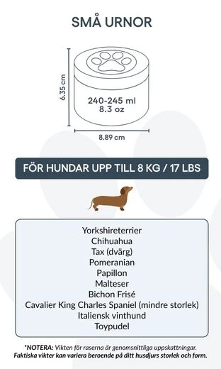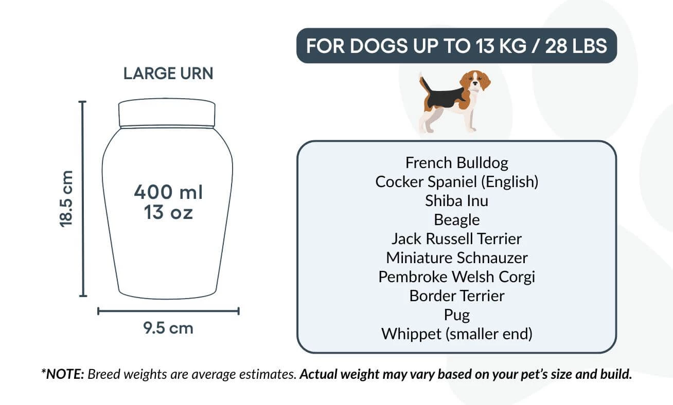 Ideal for pet cremation and dog ashes, this memorial urn is available in two sizes to accommodate small to large-sized dogs. With a secure closure and custom design, it serves as both a protective casket and a comforting symbol of your pet’s place in your heart.