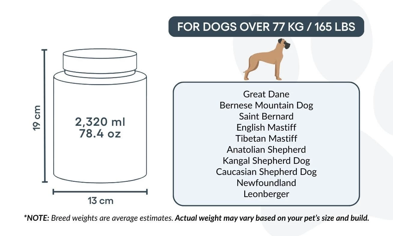 Large: 13 cm (W) x 19 cm (H) x 13 cm (L) | ~2,320 ml / 78.4 oz – suitable for dogs up to approx. 77 kg / 165 lbs