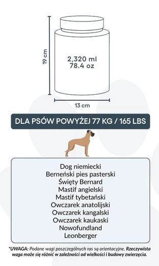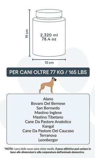 Large: 13 cm (W) x 19 cm (H) x 13 cm (L) | ~2,320 ml / 78.4 oz – suitable for dogs up to approx. 77 kg / 165 lbs
