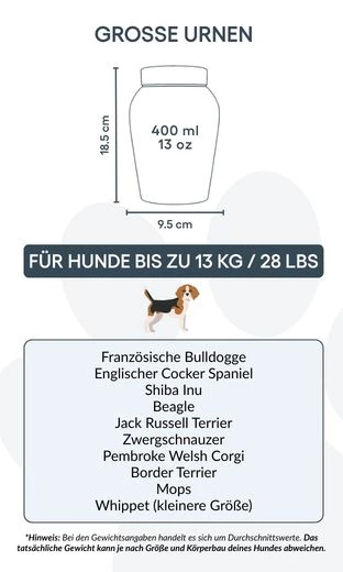 Large: 9.5 cm (W) x 18.5 cm (H) x 9.5 cm (L) | 400 ml / 13 oz – suitable for dogs up to 13 kg / 28 lbs