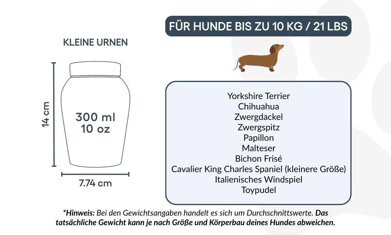 Small: 7.74 cm (W) x 14 cm (H) x 7.74 cm (L) | 300 ml / 10 oz – suitable for dogs up to 10 kg / 21 lbs