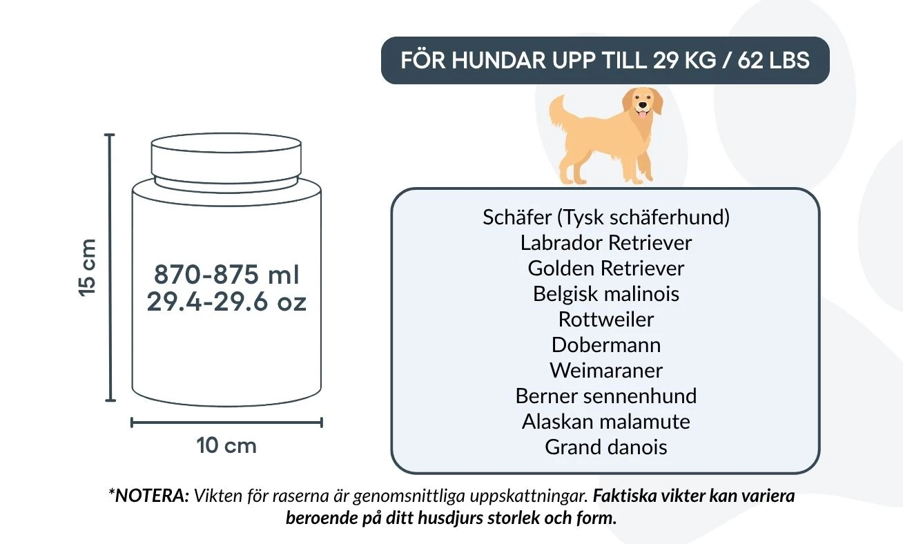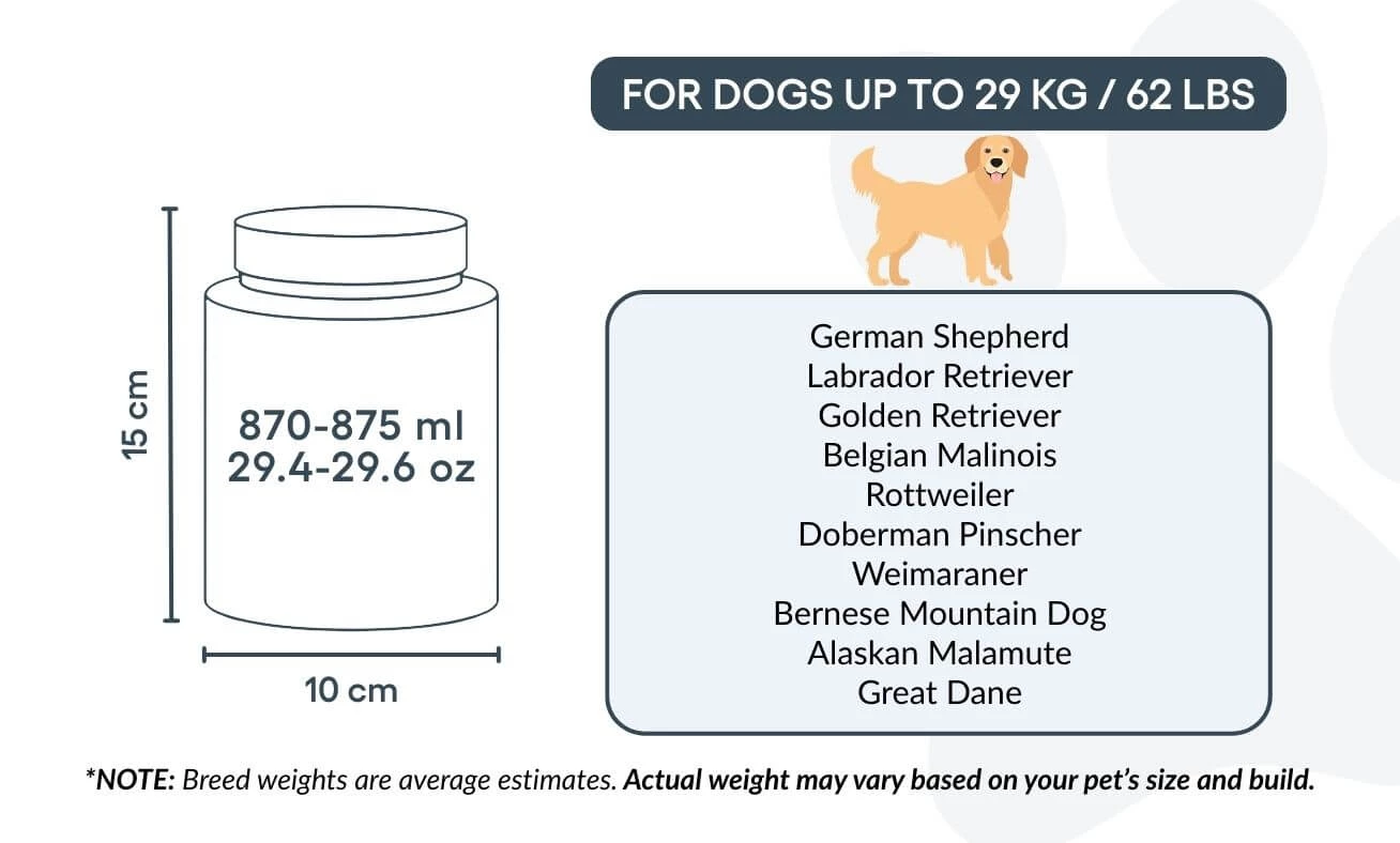 Small: 10 cm (W) x 15 cm (H) x 10 cm (L) | 870–875 ml / 29.4-29.6 oz - suitable for dogs up to approx. 29 kg / 62 lbs