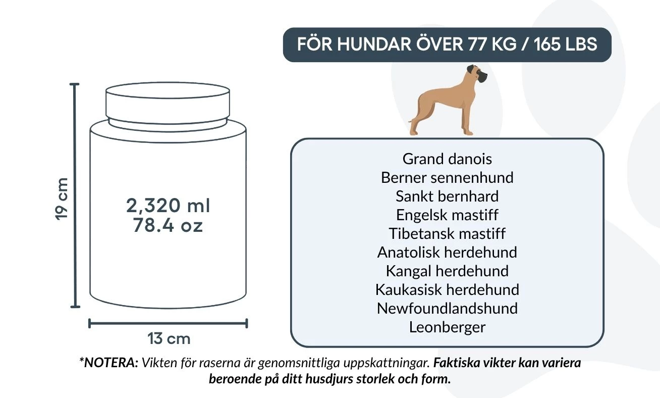 Large: 13 cm (W) x 19 cm (H) x 13 cm (L) | ~2,320 ml / 78.4 oz – suitable for dogs up to approx. 77 kg / 165 lbs