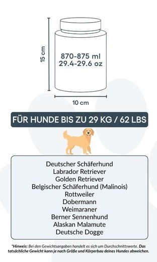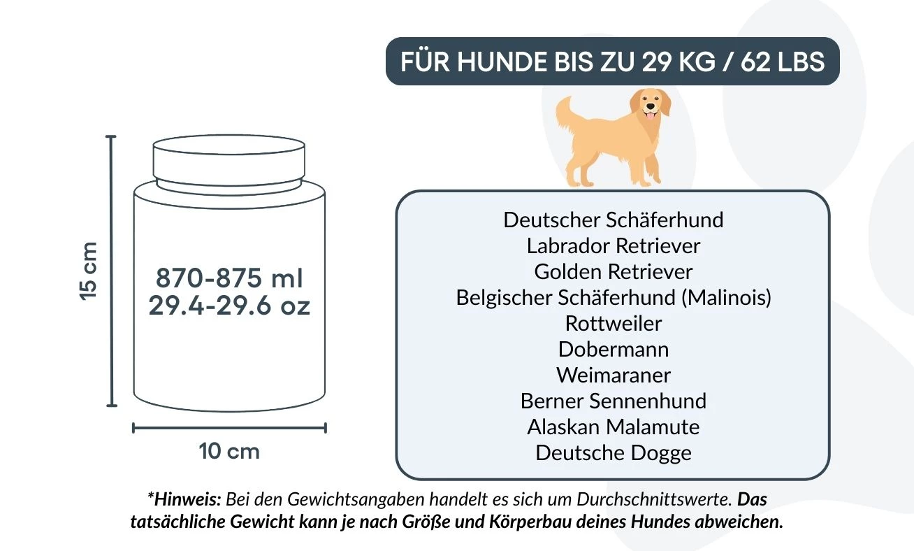 Small: 10 cm (W) x 15 cm (H) x 10 cm (L) | 870–875 ml / 29.4-29.6 oz - suitable for dogs up to approx. 29 kg / 62 lbs