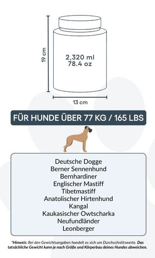 Large: 13 cm (W) x 19 cm (H) x 13 cm (L) | ~2,320 ml / 78.4 oz – suitable for dogs up to approx. 77 kg / 165 lbs