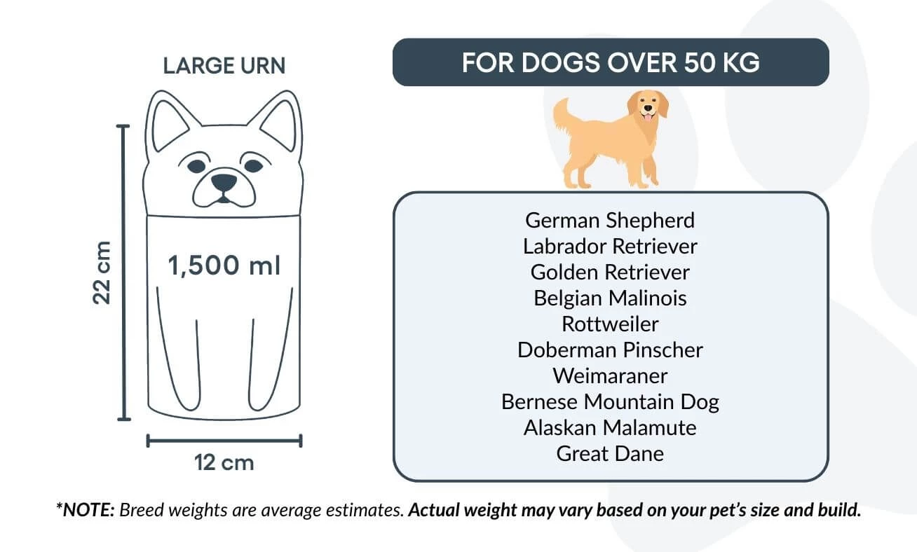 Note: Volume estimates are based on average pet cremation yields. Please consider your pet’s weight and build when choosing an urn.