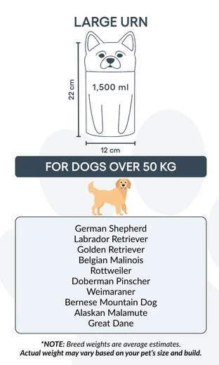 Each urn is individually crafted from durable ceramic and painted in underglaze multicolour by skilled artists, then kiln-fired at 1300°C for a vivid, lasting finish. The open eyes design adds life to the hand-painted portrait, capturing your dog’s personality in a dignified memorial. Simply provide clear photos of your dog’s body, face, ears, and tail, and the artist will create a custom design based on their unique features.