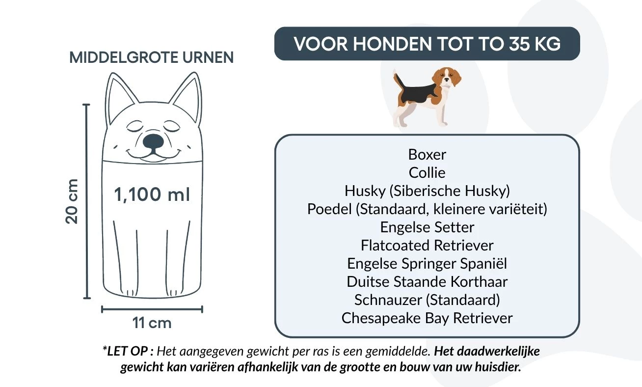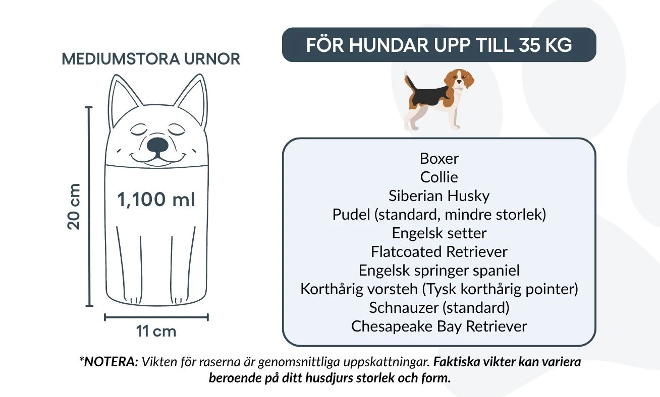 Available in three sizes for breeds up to 50 kg, this personalised dog urn offers space for custom text and is ideal for cremation ashes. The secure, sculpted form ensures safe storage and a timeless look for indoor display.