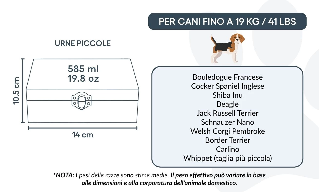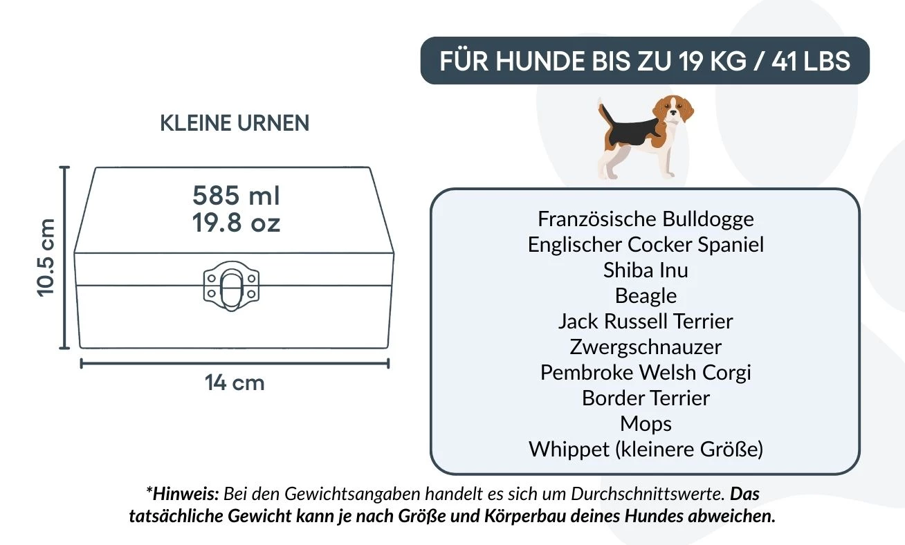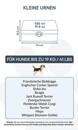 Size / Urn Capacity: 14 cm (W) x 10.5 cm (H) x 6.5 cm (L) | ~585 ml / 35.7 cubic inches / 19.8 oz | for dogs up to 19 kg / 41 lbs