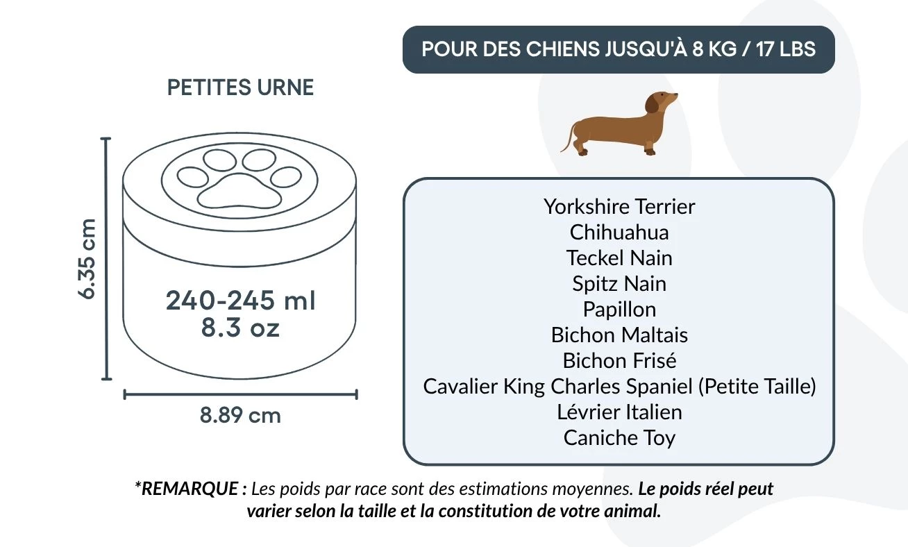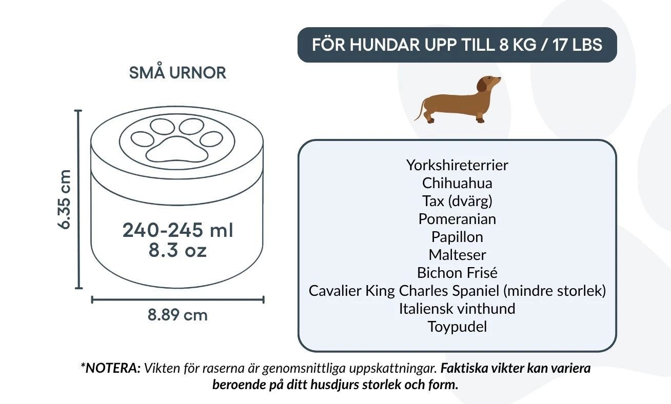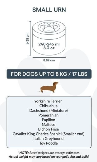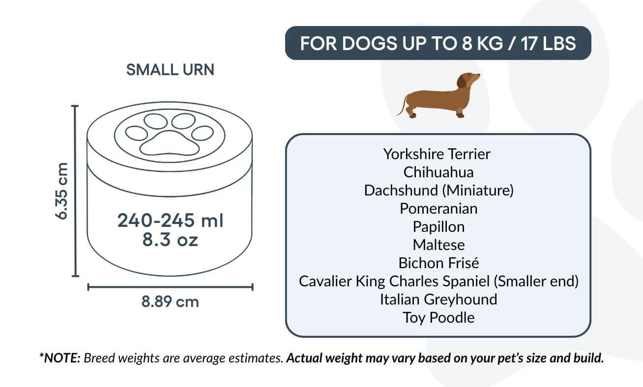 With a compact size ideal for dogs up to 8kg (17 lbs), this engraved dog urn is suited for smaller breeds and designed to securely hold your pet’s ashes. Whether displayed on a shelf, mantle, or memory corner, this wooden pet urn serves as a lasting keepsake to celebrate the life of a cherished companion.