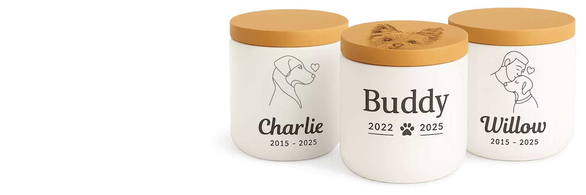 Honour your dog’s memory with this ceramic urn. A personalised pet cremation urn with name, dates and heartfelt details.