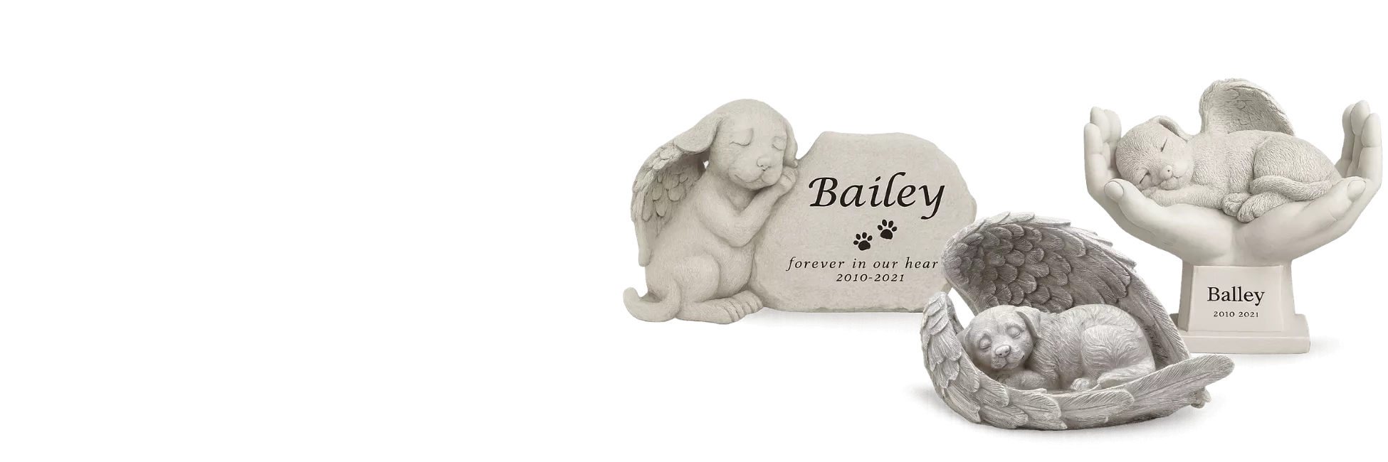 Weatherproof dog memorial statue with angel wings and elegant name engraving. A touching tribute for garden remembrance.
