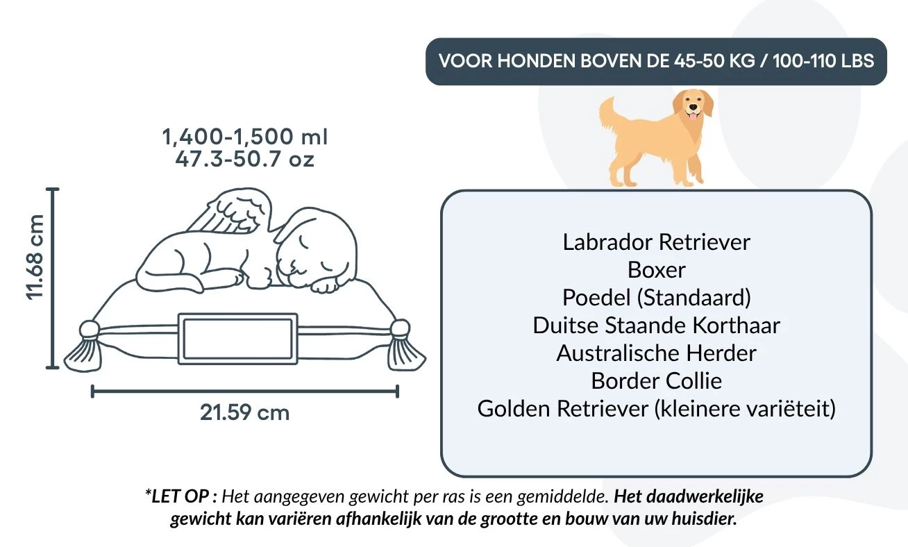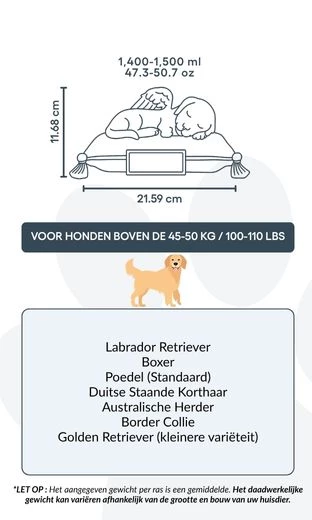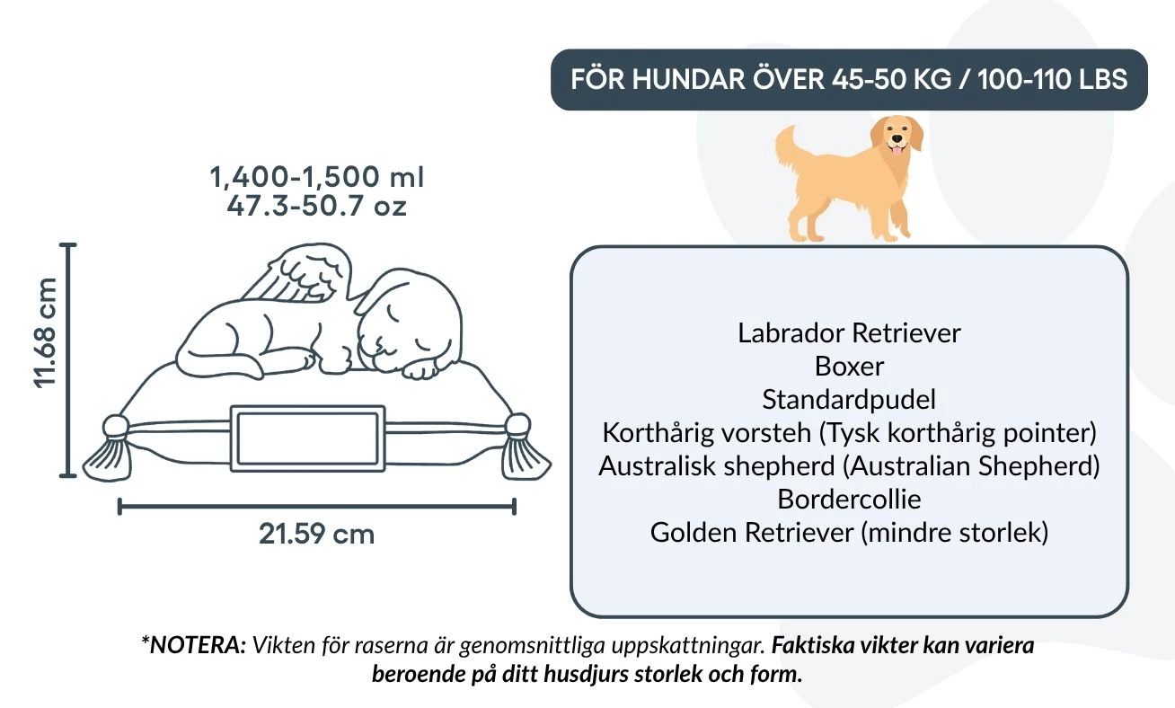 Note: Volume estimates are based on average pet cremation yields. Please consider your pet’s weight and build when choosing an urn.