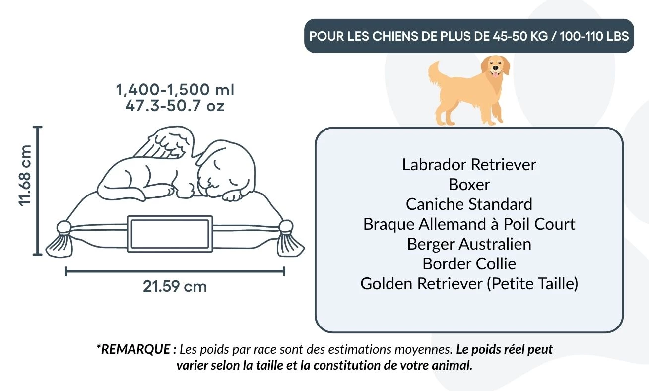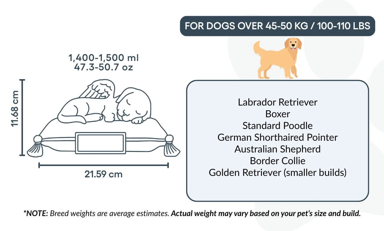 Note: Volume estimates are based on average pet cremation yields. Please consider your pet’s weight and build when choosing an urn.